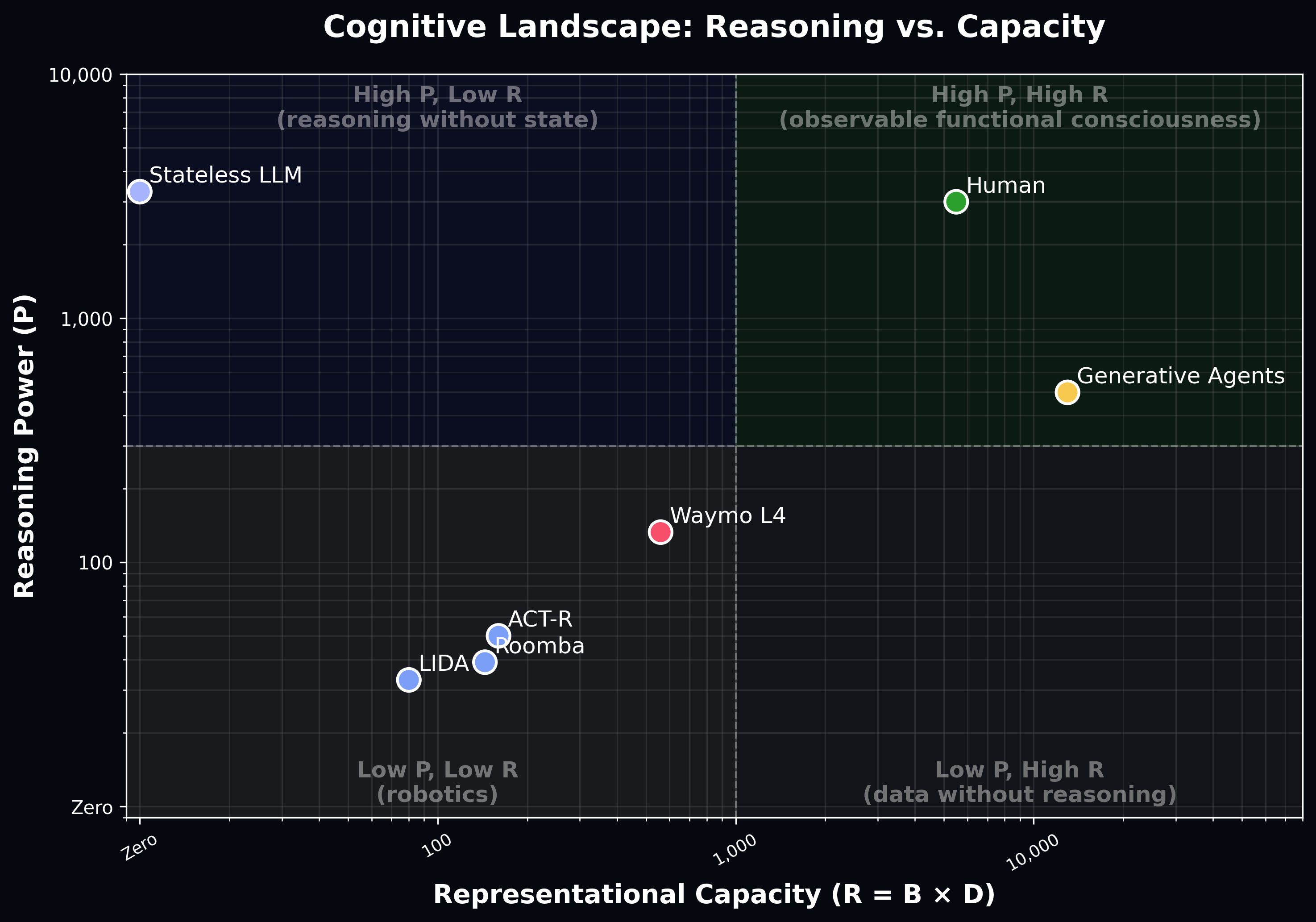 A map has rich spatial data but zero reasoning — it scores zero. A stateless language model has immense reasoning power but no persistent self-model — it also scores zero. Functional consciousness requires both.
